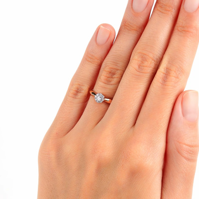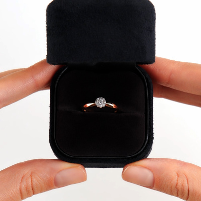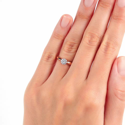 Кольцо с 1 бриллиантом природным, 0.05 карат, огранка круг 57 граней, цвет 3, чистота 6, тип огранки А; 8 бриллиантами природными, 0.07 карат, огранка круг 57 граней, цвет 3, чистота 6, тип огранки А; Розовое золото 585 пробы.