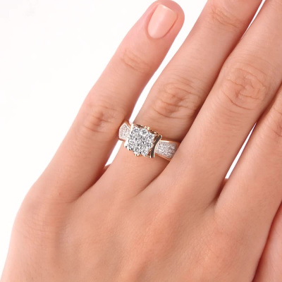 Кольцо с 4 бриллиантами природными, 0.19 карат, огранка круг 57 граней, цвет 3, чистота 6, тип огранки А; 4 бриллиантами природными, 0.12 карат, огранка круг 57 граней, цвет 3, чистота 6, тип огранки А; 25 бриллиантами природными, 0.17 карат, огранка круг 57 граней, цвет 3, чистота 6, тип огранки А; Розовое и белое золото 585 пробы.