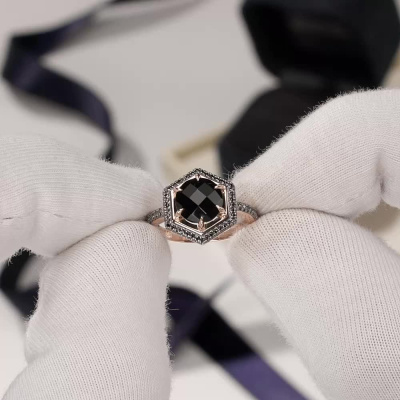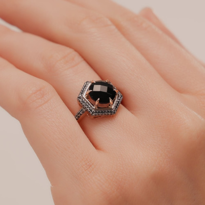 Кольцо с 56 бриллиантами черными природными облагороженными, 0.14 карат, огранка круг 57 граней, цвет 7, чистота 6, тип огранки А; 1 агатом черным природным, огранка круг чекер; Розовое золото 585 пробы.