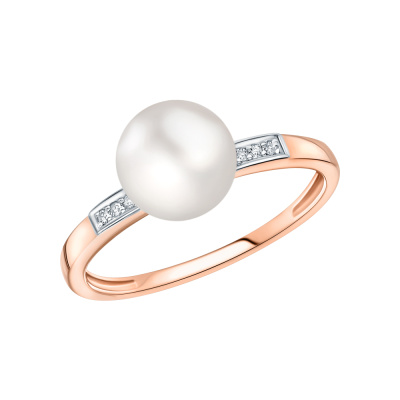 Кольцо с 6 бриллиантами природными, 0.02 карат, огранка круг 17 граней, цвет 2, чистота 2, тип огранки А; 1 жемчугом пресноводным культивированным белым; Розовое золото 585 пробы.