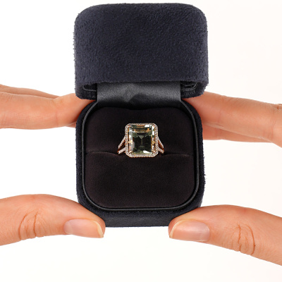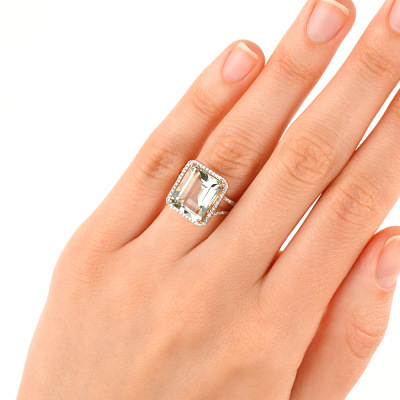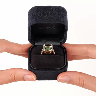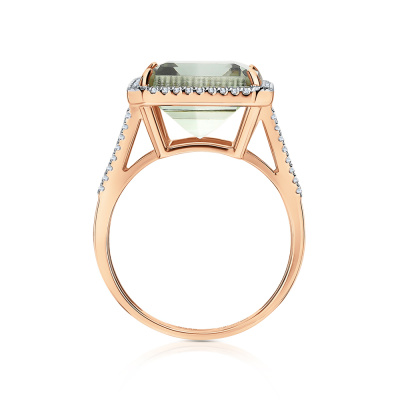 Кольцо с 1 празиолитом, 5.74 карат, тип огранки Б; 72 бриллиантами, 0.21 карат, огранка круг 17 граней, цвет 2, чистота 2, тип огранки А; Розовое золото 585 пробы.
