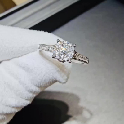 Кольцо с 1 бриллиантом природным, 0.08 карат, огранка круг 57 граней, цвет 3, чистота 6, тип огранки А; 6 бриллиантами природными, 0.128 карат, огранка круг 57 граней, цвет 3, чистота 6, тип огранки А; 6 бриллиантами природными, 0.041 карат, огранка круг 57 граней, цвет 3, чистота 6, тип огранки А; 18 бриллиантами природными, 0.053 карат, огранка круг 17 граней, цвет 2, чистота 2, тип огранки А; Белое золото 585 пробы.
