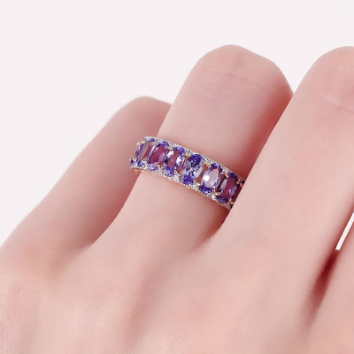 Кольцо с 18 танзанитами, 4.38 карат, тип огранки Б; 36 бриллиантами, 0.11 карат, огранка круг 17 граней, цвет 2, чистота 2, тип огранки Б; Розовое золото 585 пробы.