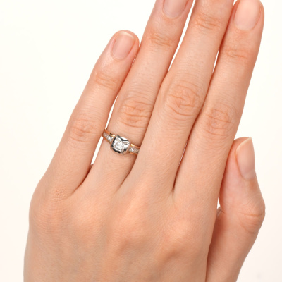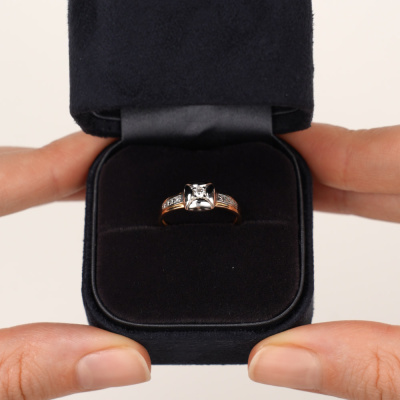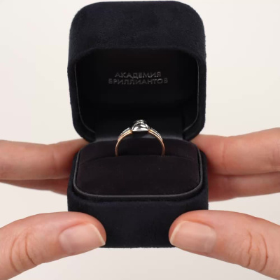 Кольцо с 1 бриллиантом природным, 0.05 карат, огранка круг 57 граней, цвет 3, чистота 5, тип огранки А; 2 бриллиантами природными, 0.01 карат, огранка круг 57 граней, цвет 3, чистота 5, тип огранки А; 6 бриллиантами природными, 0.02 карат, огранка круг 57 граней, цвет 3, чистота 5, тип огранки А; Розовое и белое золото 585 пробы.