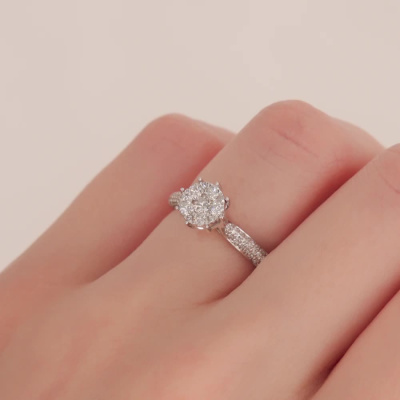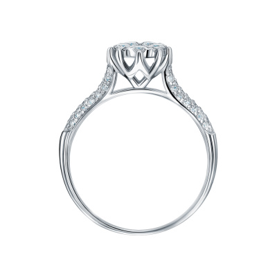 Кольцо с 1 бриллиантом природным, 0.07 карат, огранка круг 57 граней, цвет 3, чистота 6, тип огранки А; 5 бриллиантами природными, 0.22 карат, огранка круг 57 граней, цвет 3, чистота 6, тип огранки А; 45 бриллиантами природными, 0.15 карат, огранка круг 17 граней, цвет 2, чистота 2, тип огранки А; 4 бриллиантами природными, 0.008 карат, огранка круг 17 граней, цвет 2, чистота 2, тип огранки А; Белое золото 585 пробы.