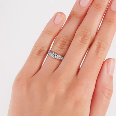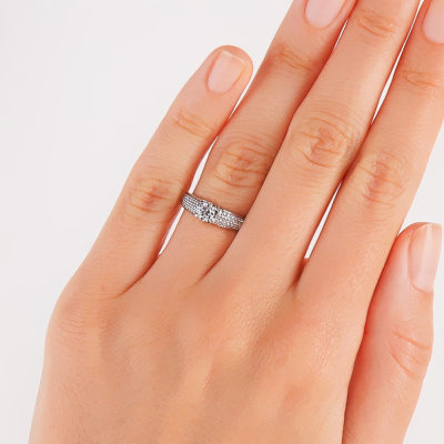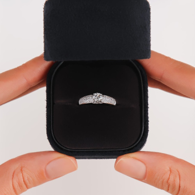 Кольцо с 1 бриллиантом природным, 0.32 карат, огранка круг 57 граней, цвет 3, чистота 6, тип огранки А; 66 бриллиантами природными, 0.19 карат, огранка круг 17 граней, цвет 2, чистота 2, тип огранки А; Белое золото 585 пробы.