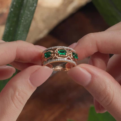 Кольцо с 50 бриллиантами природными, 0.17 карат, огранка круг 17 граней, цвет 2, чистота 2, тип огранки А; 3 гидротермальными изумрудами, 0.64 карат, тип огранки Б; Розовое золото 585 пробы.