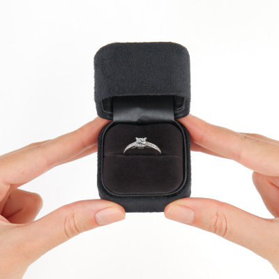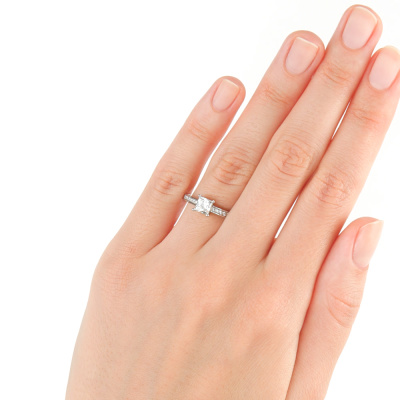Кольцо с 1 бриллиантом, 0.7 карат, огранка принцесса 65 граней, цвет 4, чистота 6, тип огранки А; 18 бриллиантами, 0.14 карат, огранка круг 57 граней, цвет 3, чистота 6, тип огранки А; Платина 950 пробы.