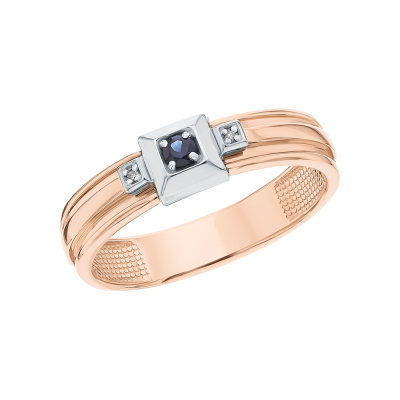Кольцо с 2 бриллиантами природными, 0.008 карат, огранка круг 17 граней, цвет 2, чистота 2, тип огранки А; 1 сапфиром синтетическим, 0.08 карат, тип огранки В; Розовое и белое золото 585 пробы.