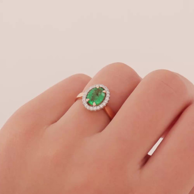 Кольцо с 22 бриллиантами природными, 0.12 карат, огранка круг 57 граней, цвет 3, чистота 6, тип огранки А; 1 изумрудом природным, 1.02 карат, цвет 3, чистота 3, тип огранки Б; Розовое золото 585 пробы.