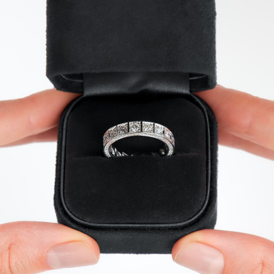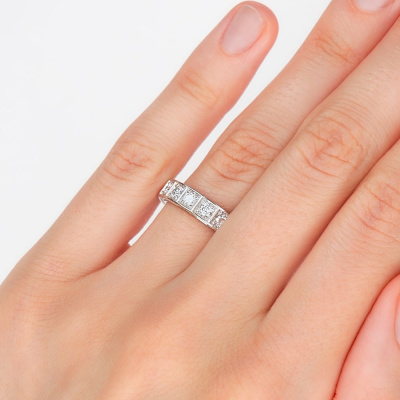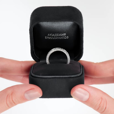 Кольцо с 16 бриллиантами природными, 1.19 карат, огранка круг 57 граней, цвет 4, чистота 6, тип огранки А; 110 бриллиантами природными, 0.33 карат, огранка круг 17 граней, цвет 2, чистота 2, тип огранки А; Белое золото 585 пробы.