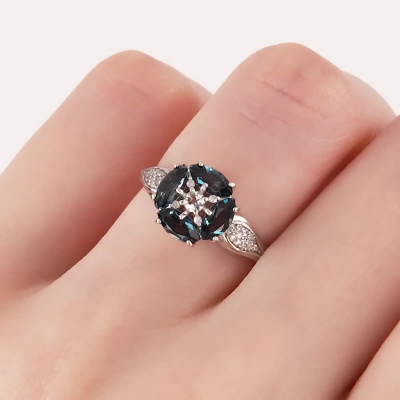 Кольцо с 4 бриллиантами природными, 0.01 карат, огранка круг 17 граней, цвет 2, чистота 2, тип огранки Б; 22 бриллиантами природными, 0.03 карат, огранка круг 17 граней, цвет 2, чистота 2, тип огранки Б; 4 топазами лондон природными, 1.07 карат, тип огранки Б; 1 топазом бесцветным природным, 0.07 карат, тип огранки В; Белое золото 585 пробы.