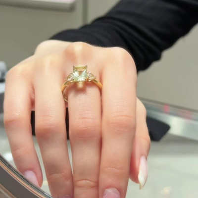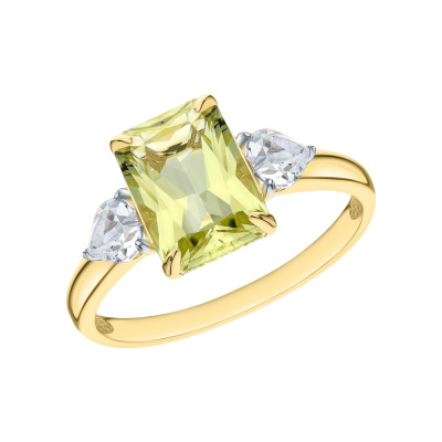 Кольцо с 1 кварцем лимонным природным, 2.45 карат, тип огранки Б; 2 кварцами бесцветными природными, 0.45 карат, тип огранки Б; Желтое золото 585 пробы.