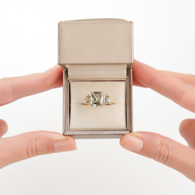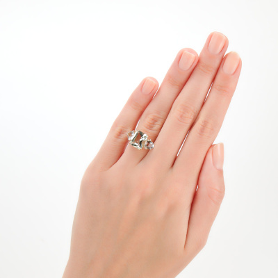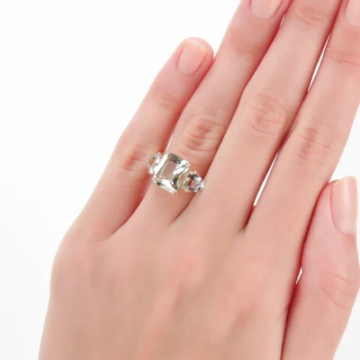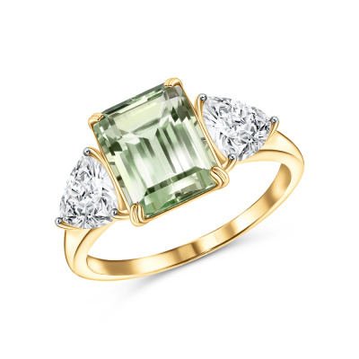 Кольцо с 1 празиолитом природным, 2.81 карат; 2 горными хрусталями природными, 1.27 карат; Желтое золото 585 пробы.