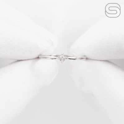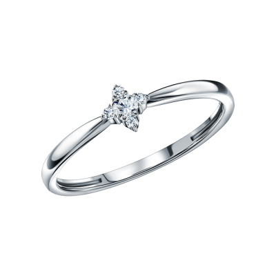 Кольцо с 1 бриллиантом природным, 0.05 карат, огранка круг 57 граней, цвет 3, чистота 6, тип огранки А; 4 бриллиантами природными, 0.02 карат, огранка круг 17 граней, цвет 2, чистота 2, тип огранки А; Белое золото 585 пробы.