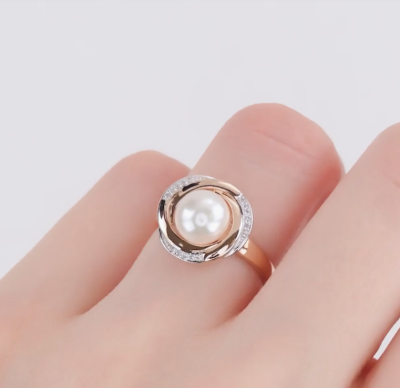 Кольцо с 15 бриллиантами природными, 0.03 карат, огранка круг 17 граней, цвет 2, чистота 2, тип огранки А; 1 жемчугом пресноводным культивированным белым; Розовое золото 585 пробы.