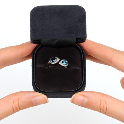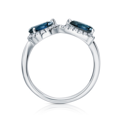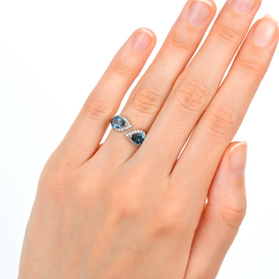 Кольцо с 34 бриллиантами природными, 0.12 карат, огранка круг 17 граней, цвет 2, чистота 2, тип огранки А; 2 топазами лондон природными, 1.5 карат; Белое золото 585 пробы.