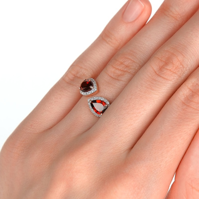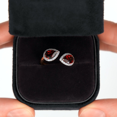 Кольцо с 34 бриллиантами природными, 0.11 карат, огранка круг 17 граней, цвет 2, чистота 2, тип огранки А; 2 гранатами природными, 1.62 карат; Розовое золото 585 пробы.