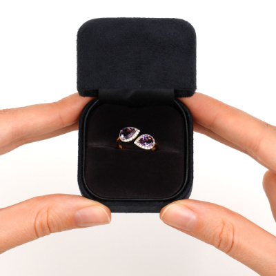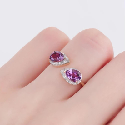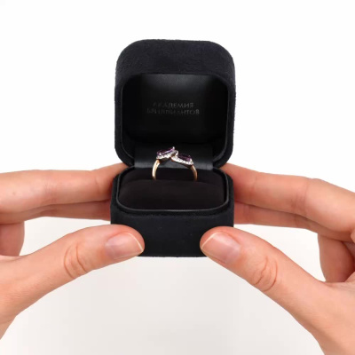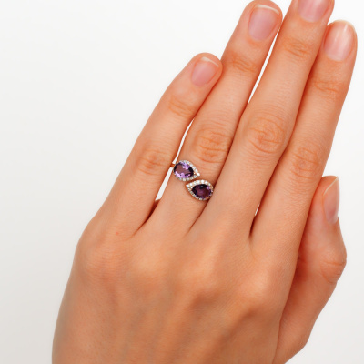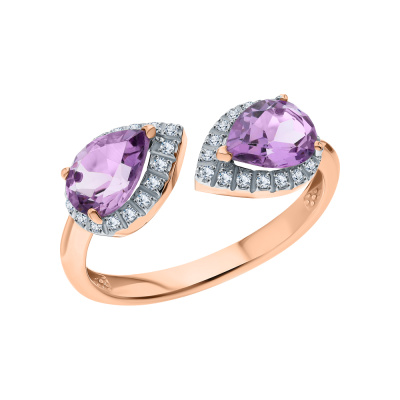 Кольцо с 34 бриллиантами природными, 0.11 карат, огранка круг 17 граней, цвет 2, чистота 2, тип огранки А; 2 аметистами природными, 1.24 карат; Розовое золото 585 пробы.