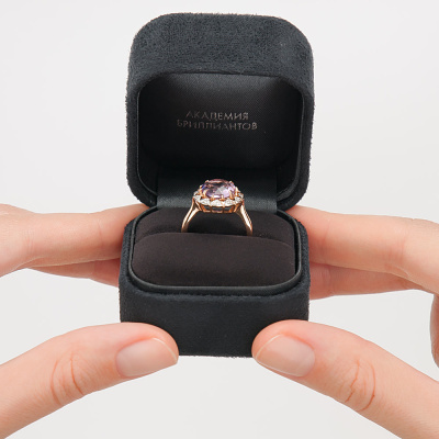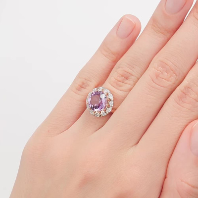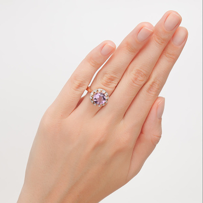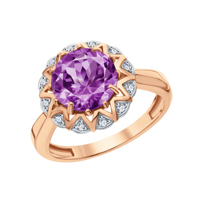 Кольцо с 12 бриллиантами природными, 0.087 карат, огранка круг 17 граней, цвет 2, чистота 2; 1 аметистом природным, 2.426 карат; Розовое золото 585 пробы.