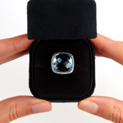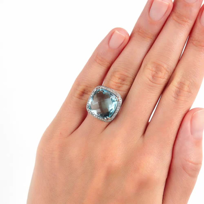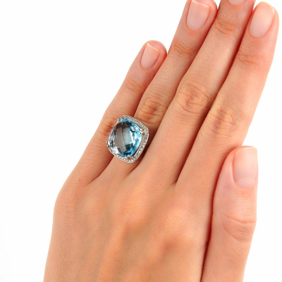 Кольцо с 44 бриллиантами природными, 0.18 карат, огранка круг 17 граней, цвет 2, чистота 2, тип огранки А; 1 топазом скай природным, 12.54 карат; Белое золото 585 пробы.