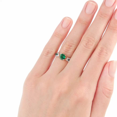 Кольцо с 1 бриллиантом природным, 0.003 карат, огранка круг 17 граней, цвет 2, чистота 2, тип огранки А; 22 бриллиантами природными, 0.04 карат, огранка круг 17 граней, цвет 2, чистота 2, тип огранки А; 1 гидротермальным изумрудом, 0.68 карат; 6 гидротермальными изумрудами, 0.12 карат; Розовое золото 585 пробы.
