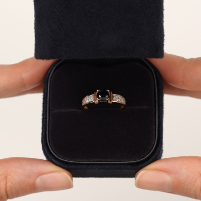 Кольцо с 1 сапфиром, 0.54 карат, цвет 2, чистота 2, тип огранки В; 28 бриллиантами, 0.11 карат, огранка круг 17 граней, цвет 2, чистота 2, тип огранки А; Розовое золото 585 пробы.