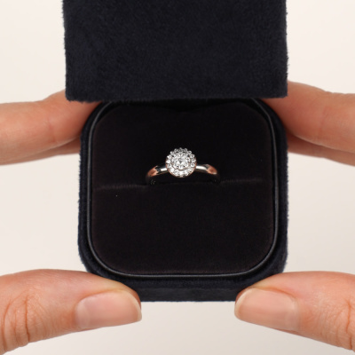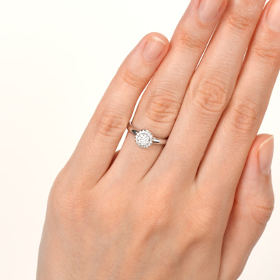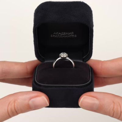 Кольцо с 1 бриллиантом природным, 0.04 карат, огранка круг 57 граней, цвет 3, чистота 6, тип огранки А; 8 бриллиантами природными, 0.05 карат, огранка круг 57 граней, цвет 3, чистота 6, тип огранки А; 16 бриллиантами природными, 0.07 карат, огранка круг 57 граней, цвет 3, чистота 6, тип огранки А; Белое золото 585 пробы.