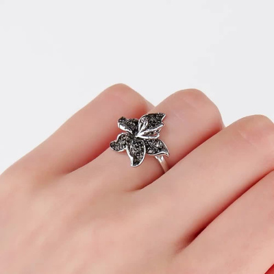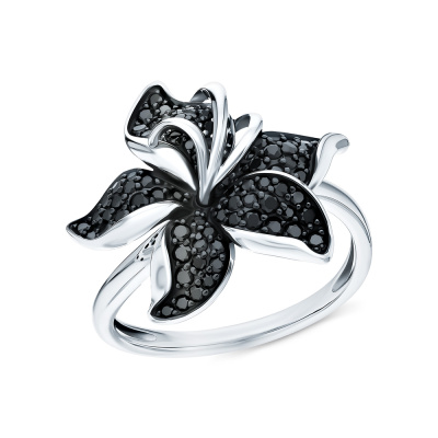 Кольцо с 16 бриллиантами черными природными облагороженными, 0.13 карат, огранка круг 57 граней, цвет 7, чистота 6, тип огранки А; 59 бриллиантами черными природными облагороженными, 0.35 карат, огранка круг 57 граней, цвет 7, чистота 6, тип огранки А; Белое золото 585 пробы.