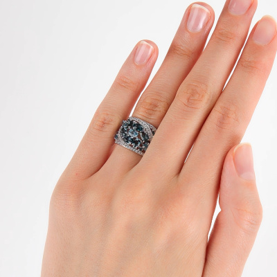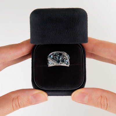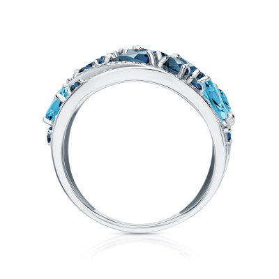 Кольцо с 72 бриллиантами природными, 0.22 карат, огранка круг 17 граней, цвет 2, чистота 2, тип огранки А; 2 топазами лондон природными, 0.51 карат; 2 топазами свисс природными, 0.49 карат; 2 топазами лондон природными, 0.44 карат; 3 топазами свисс природными, 0.61 карат; 2 топазами лондон природными, 0.39 карат; 10 топазами лондон природными, 0.19 карат; Белое золото 585 пробы.