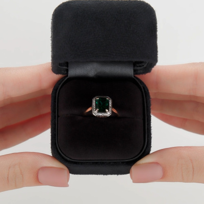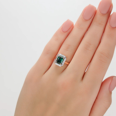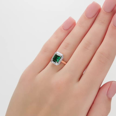 Кольцо с 24 бриллиантами природными, 0.109 карат, огранка круг 17 граней, цвет 2, чистота 2, тип огранки А; 1 гидротермальным изумрудом, 1.217 карат; Розовое золото 585 пробы.