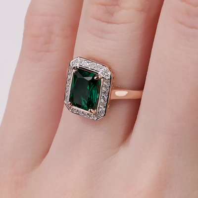 Кольцо с 24 бриллиантами природными, 0.11 карат, огранка круг 17 граней, цвет 2, чистота 2, тип огранки А; 1 гидротермальным изумрудом, 1.17 карат; Розовое золото 585 пробы.