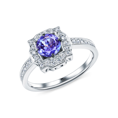 Кольцо с 8 бриллиантами природными, 0.06 карат, огранка круг 57 граней, цвет 3, чистота 6, тип огранки А; 34 бриллиантами природными, 0.2 карат, огранка круг 57 граней, цвет 3, чистота 6, тип огранки А; 1 танзанитом природным, 0.82 карат; Белое золото 585 пробы.