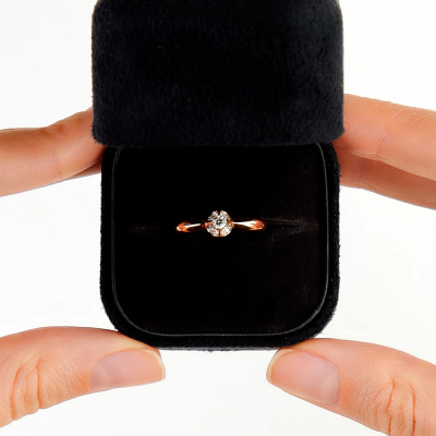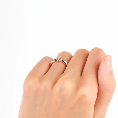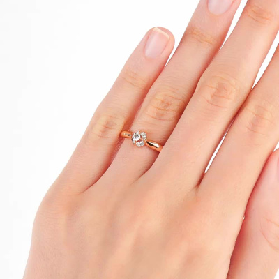 Кольцо с 1 бриллиантом природным, 0.07 карат, огранка круг 57 граней, цвет 4, чистота 6, тип огранки А; 4 бриллиантами природными, 0.03 карат, огранка круг 57 граней, цвет 4, чистота 6, тип огранки А; Розовое золото 585 пробы.