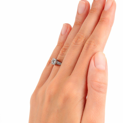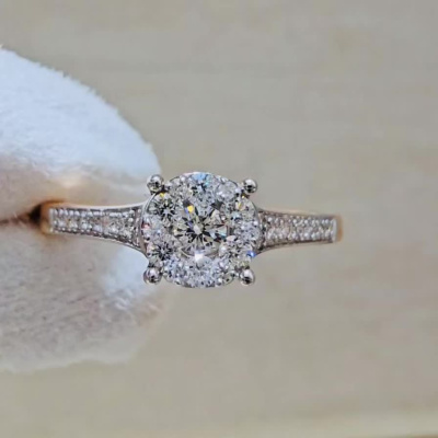 Кольцо с 1 бриллиантом, 0.076 карат, огранка круг 57 граней, цвет 3, чистота 6, тип огранки А; 6 бриллиантами, 0.12 карат, огранка круг 17 граней, цвет 2, чистота 2, тип огранки А; 12 бриллиантами, 0.05 карат, огранка круг 17 граней, цвет 2, чистота 2, тип огранки Б; 585 пробы.