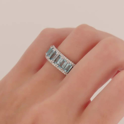 Кольцо с 40 бриллиантами природными, 0.12 карат, огранка круг 17 граней, цвет 2, чистота 2, тип огранки А; 7 топазами свисс природными, 1.97 карат; Белое золото 585 пробы.
