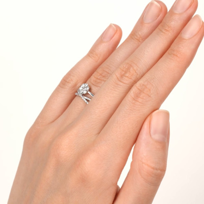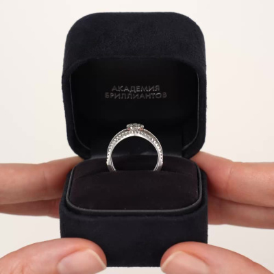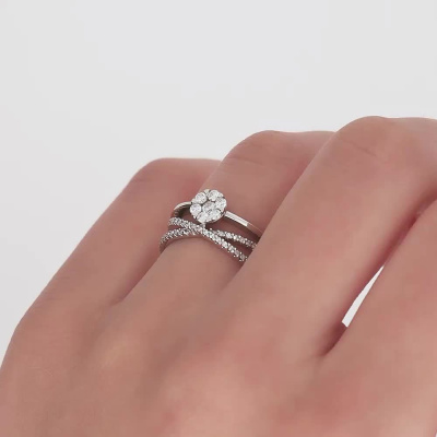 Кольцо с 1 бриллиантом природным, 0.06 карат, огранка круг 57 граней, цвет 3, чистота 6, тип огранки А; 6 бриллиантами природными, 0.18 карат, огранка круг 57 граней, цвет 4, чистота 6, тип огранки А; 45 бриллиантами природными, 0.14 карат, огранка круг 17 граней, цвет 2, чистота 2, тип огранки А; Белое золото 585 пробы.