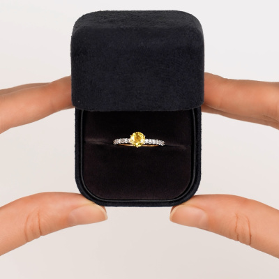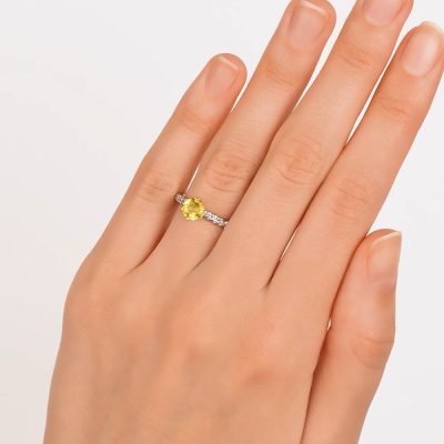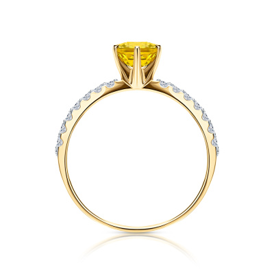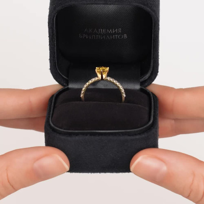 Кольцо с 14 бриллиантами природными, 0.22 карат, огранка круг 17 граней, цвет 2, чистота 2, тип огранки А; 1 сапфиром желтым природным, 0.74 карат; Желтое золото 585 пробы.