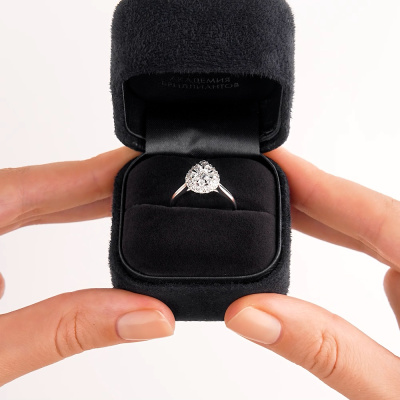 Кольцо с 1 бриллиантом природным, 0.19 карат, огранка круг 57 граней, цвет 3, чистота 6, тип огранки А; 2 бриллиантами природными, 0.12 карат, огранка круг 57 граней, цвет 3, чистота 6, тип огранки А; 6 бриллиантами природными, 0.13 карат, огранка круг 57 граней, цвет 3, чистота 6, тип огранки А; 20 бриллиантами природными, 0.13 карат, огранка круг 57 граней, цвет 3, чистота 6, тип огранки А; Белое золото 585 пробы.