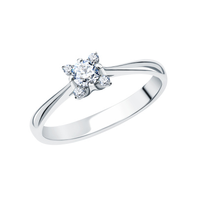 Кольцо с 1 бриллиантом, 0.2 карат, огранка круг 57 граней, цвет 3, чистота 6, тип огранки А; 4 бриллиантами, 0.04 карат, огранка круг 57 граней, цвет 3, чистота 6, тип огранки А; Белое золото 585 пробы.