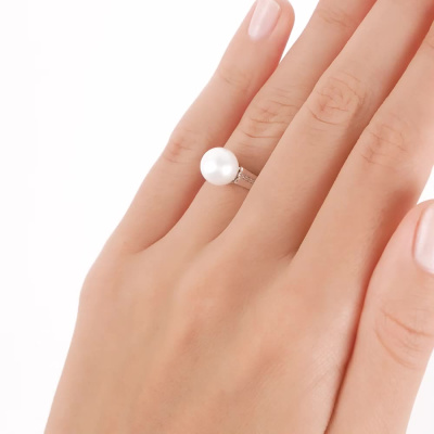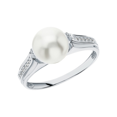 Кольцо с 14 бриллиантами природными, 0.03 карат, огранка круг 17 граней, цвет 2, чистота 2, тип огранки А; 1 жемчугом пресноводным культивированным белым; Белое золото 585 пробы.
