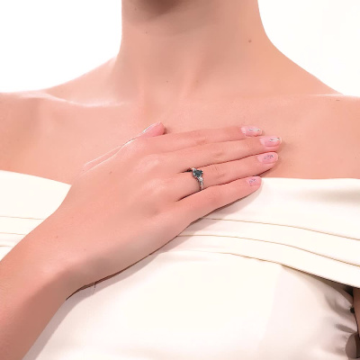 Кольцо с 8 бриллиантами природными, 0.03 карат, огранка круг 17 граней, цвет 2, чистота 2, тип огранки Б; 14 бриллиантами природными, 0.03 карат, огранка круг 17 граней, цвет 2, чистота 2, тип огранки Б; 1 топазом лондон природным, 0.74 карат; Белое золото 585 пробы.