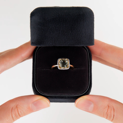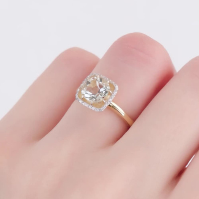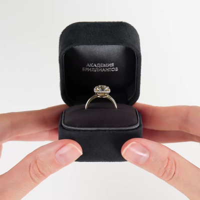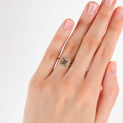 Кольцо с 32 бриллиантами природными, 0.06 карат, огранка круг 17 граней, цвет 2, чистота 2, тип огранки А; 1 празиолитом природным, 1.29 карат; Желтое золото 585 пробы.