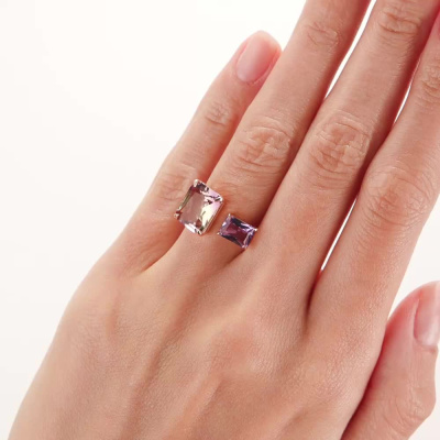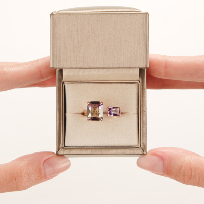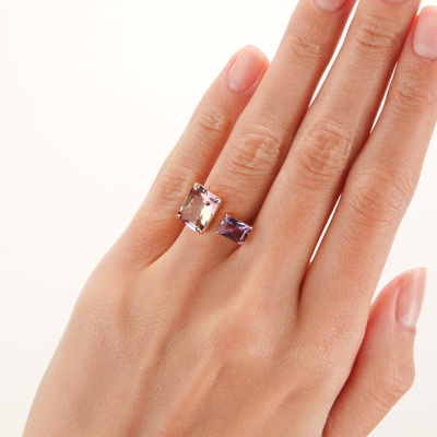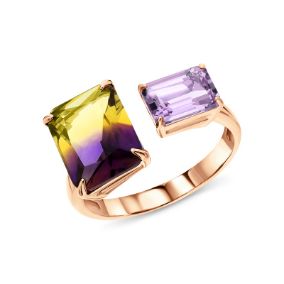 Кольцо с 1 аметистом природным, 0.964 карат, тип огранки Б; 1 аметрином ГТ, тип огранки Б; Розовое золото 585 пробы.