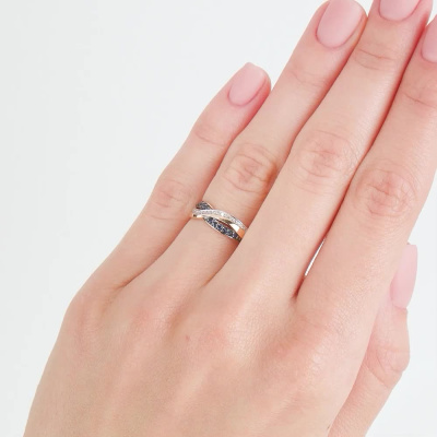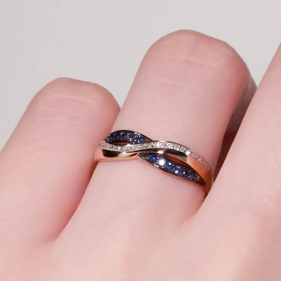 Кольцо с 24 бриллиантами природными, 0.05 карат, огранка круг 17 граней, цвет 2, чистота 2, тип огранки Б; 11 сапфирами природными, 0.1 карат, цвет 2, чистота 2, тип огранки В; Розовое золото 585 пробы.