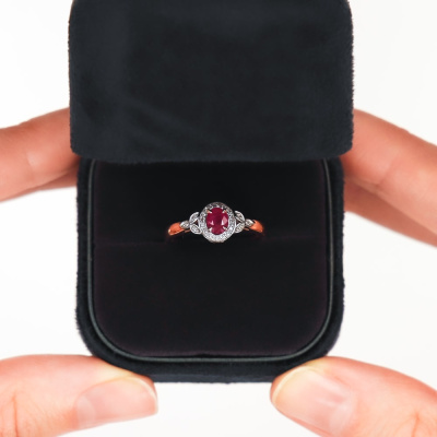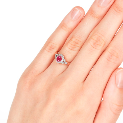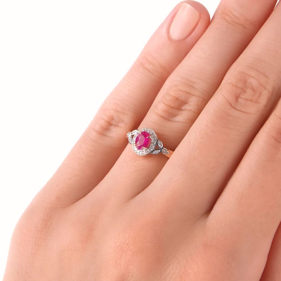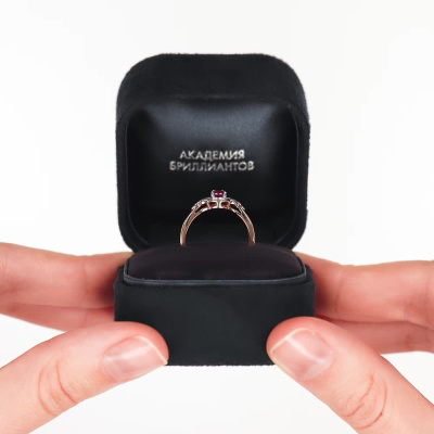Кольцо с 26 бриллиантами природными, 0.05 карат, огранка круг 17 граней, цвет 2, чистота 2, тип огранки А; 1 рубином природным, 0.43 карат, цвет 2, чистота 3, тип огранки Б; Розовое золото 585 пробы.