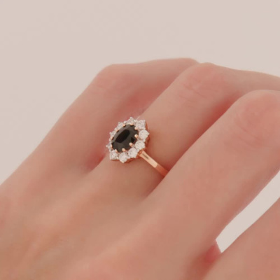 Кольцо с 10 бриллиантами природными, 0.37 карат, огранка круг 57 граней, цвет 3, чистота 6, тип огранки А; 1 сапфиром природным, 0.93 карат, цвет 2, чистота 2, тип огранки Б; Розовое золото 585 пробы.