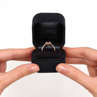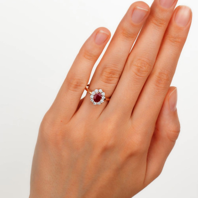 Кольцо с 10 бриллиантами природными, 0.358 карат, огранка круг 57 граней, цвет 3, чистота 6; 1 рубином природным, 0.861 карат, цвет 2, чистота 3; Розовое золото 585 пробы.