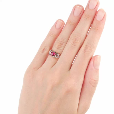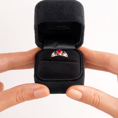 Кольцо с 4 бриллиантами природными, 0.01 карат, огранка круг 17 граней, цвет 2, чистота 2, тип огранки А; 8 бриллиантами природными, 0.01 карат, огранка круг 17 граней, цвет 2, чистота 2, тип огранки Б; 1 рубином синтетическим, 0.61 карат; Розовое золото 585 пробы.