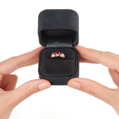 Кольцо с 4 бриллиантами природными, 0.014 карат, огранка круг 17 граней, цвет 2, чистота 2, тип огранки А; 8 бриллиантами природными, 0.017 карат, огранка круг 17 граней, цвет 2, чистота 2, тип огранки А; 1 рубином синтетическим, 0.608 карат; Розовое золото 585 пробы.